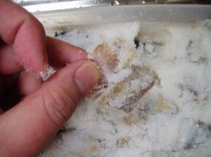 イワシがなんとなく黄色くなっていると同時に、塩が水気を含んでしめっぽくなって来た。