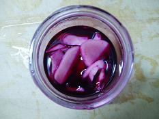 スライスした新ショウガを梅酢に漬ける。そのまま、冷蔵庫で寝かせる。