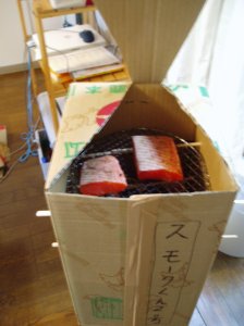 前回同様、アルミをひいた耐熱皿の上でスモークウッドを燃やし、じっくりと薫製する。それにしてもでかい・・・。