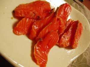 そして出来上がった自慢のスモークサーモン。期待を裏切らず、すこぶる美味い。
