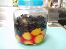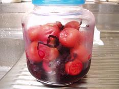この状態で梅雨が明けるまで待ちます。カラッと晴れたら、いよいよ土用干しを行い、 最終段階に突入です。 ところで・・・赤紫蘇をたくさん買ったのですが、余ってしまったので、焼酎に漬け込んでみました。 そして一週間、いい感じに仕上がりました。