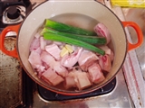 鍋にアキレス腱、ショウガ、長ネギの青い部分、水、酒少々、五香粉少々を入れ、ぐつぐつ煮る。アクがでるので取り除くこと。