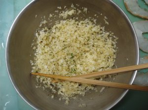 溶かしバターにニンニクのみじん切りとオリーブオイル、ハーブミックスを加え、さらにパン粉を加えて香草パン粉のできあがり。