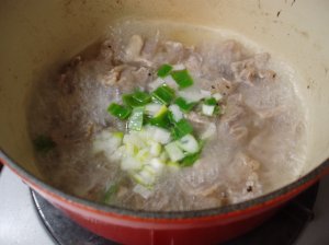 アクが出なくなったところで、にんにくと長ネギ、塩胡椒を入れる。牛すじは、お好みの硬さまで煮こむ。