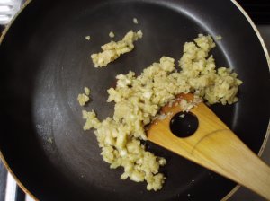 ニンニクをオリーブオイルで香りが出るまで炒め、茄子カップを入れて