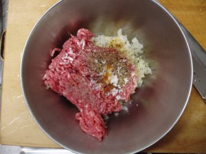 挽肉にタマネギのみじん切り、ニンニク、塩胡椒、醤油、イタリアンハーブミックスを加えて、