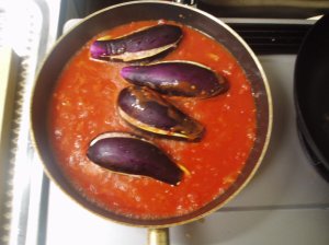 さて料理に取り掛かるが、茄子を上から1/4のところで切り落とし、中身をくり抜く。