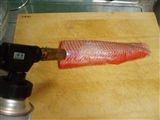 直火で表面をさっとあぶる。今回はバーナーを使ったが、もちろんガスコンロでもかまわない。中まで火を通さなことこが肝心だ。